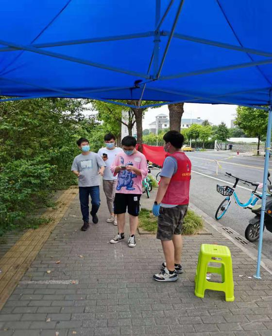 沖在一線,當(dāng)先鋒。正逢南京酷暑,毛曉春與孫斌負(fù)責(zé)在入口處查驗(yàn)健康碼,協(xié)助市民綠碼通行?!澳?,請帶好口罩?!薄澳?,請出示健康碼?!弊鳛闄z測點(diǎn)第一道關(guān)口,兩位男同胞展現(xiàn)了不輸女性的耐心與溫柔:個(gè)別老人家沒有相關(guān)軟件,個(gè)別市民沒有及時(shí)更新數(shù)據(jù),他們手把手提供幫助與支持,烈日下的背影早已汗如雨下。