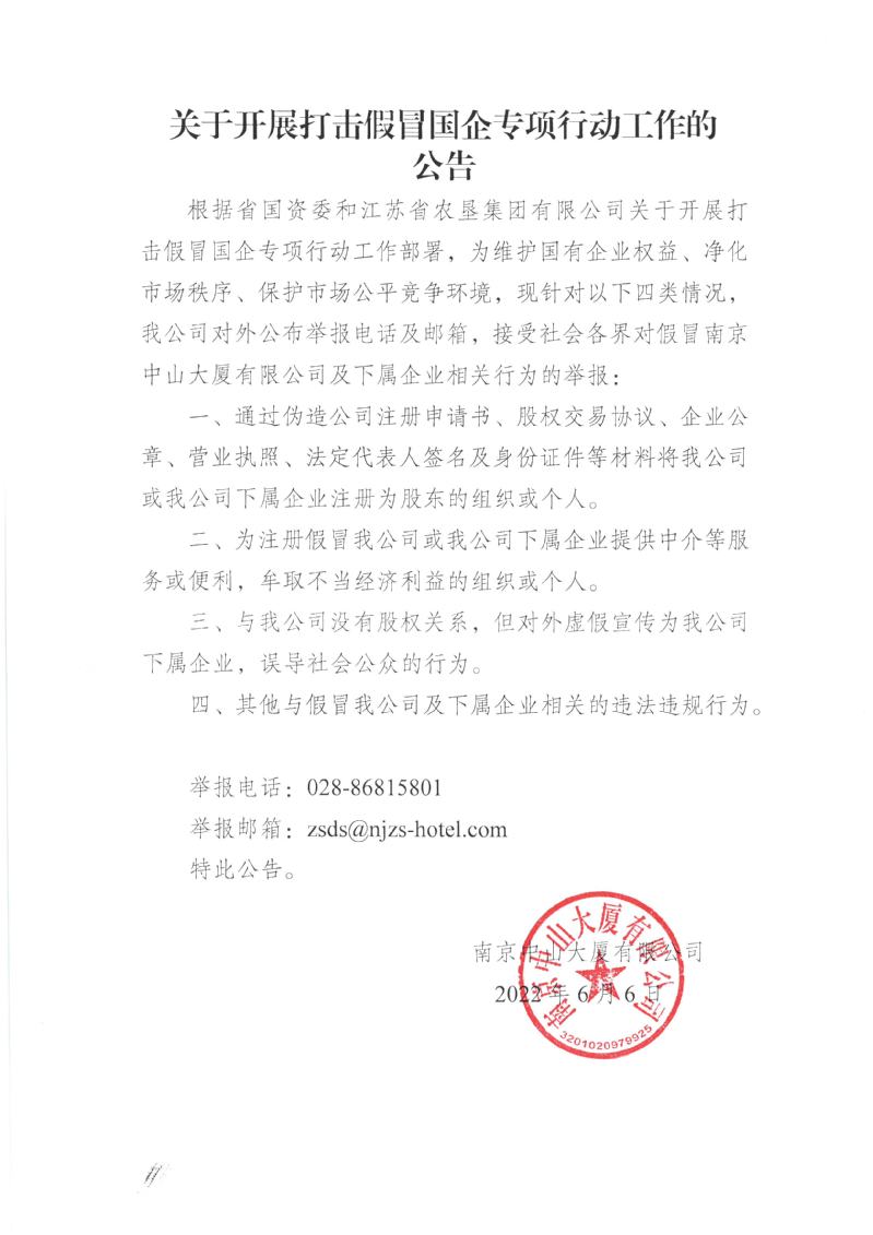 根據(jù)省國資委和江蘇省農(nóng)墾集團(tuán)有限公司關(guān)于開展打擊假冒國企專項(xiàng)行動(dòng)工作部署,為維護(hù)國有企業(yè)權(quán)益、凈化市場秩序、保護(hù)市場公平競爭環(huán)境,現(xiàn)針對(duì)以下四類情況,我公司對(duì)外公布舉報(bào)電話及郵箱,接受社會(huì)各界對(duì)假冒南京中山大廈有限公司及下屬企業(yè)相關(guān)行為的舉報(bào):