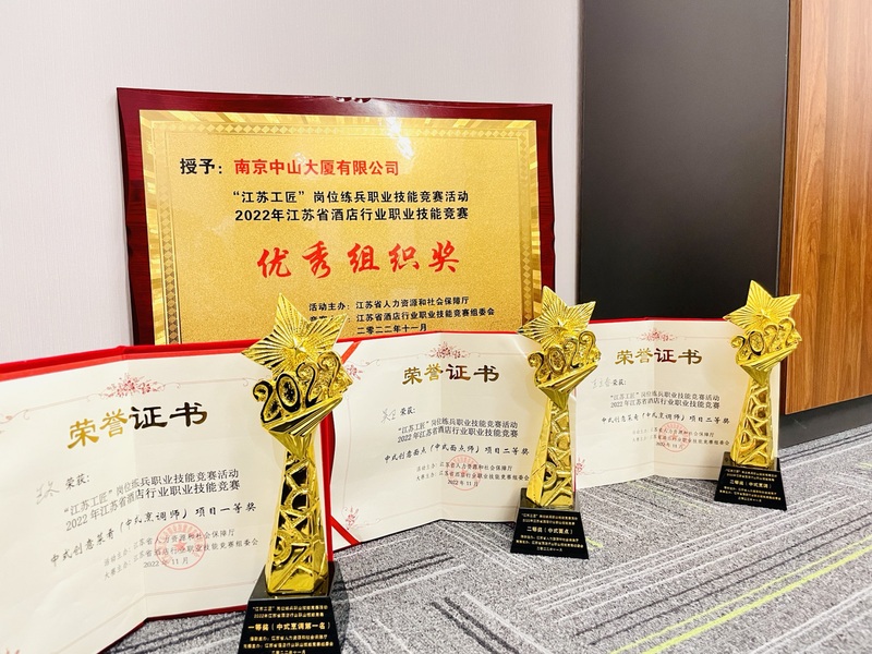 在昨天結(jié)束的2022年江蘇省酒店行業(yè)職業(yè)技能競賽暨“鐘山工匠”杯大賽總決賽上,中山精品酒店餐飲部經(jīng)理、行政總廚王冬在中式創(chuàng)意菜肴項目中拔得頭籌榮獲一等獎,精品酒店餐飲部爐灶主廚王立春和中點主廚吳衛(wèi)分獲中式創(chuàng)意菜肴和中式創(chuàng)新面點項目二等獎。公司獲得了優(yōu)秀組織獎。
