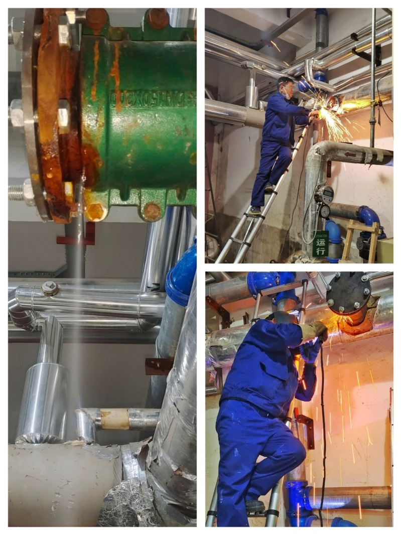 供熱無小事,冷暖系經(jīng)營。1月16號鍋爐房熱水管道突發(fā)泄漏,工程部第一時間確定搶修方案,迅速組織員工展開搶修工作,克服高空作業(yè)的困難,在計劃財務(wù)部采購班組積極配合下,及時完成配件采購。由于管道老化腐蝕較為嚴重增加焊接難度,在經(jīng)過勘查施工現(xiàn)場、材料準備后,在確保施工安全條件下,大家齊心協(xié)力,充分發(fā)揚工程人“敢打敢拼、善打硬仗”的優(yōu)良傳統(tǒng),經(jīng)過3小時搶修,圓滿完成了搶修工作。這時大家才發(fā)現(xiàn)已經(jīng)是近中午13點了,大家午飯還沒有吃,但經(jīng)營點用上了熱水,大家都很開心。