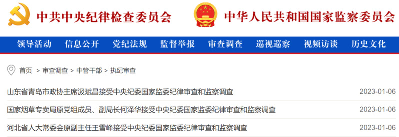 山東省青島市政協(xié)主席汲斌昌,國(guó)家煙草專賣局原黨組成員、副局長(zhǎng)何澤華,河北省人大常委會(huì)原副主任王雪峰接受中央紀(jì)委國(guó)家監(jiān)委紀(jì)律審查和監(jiān)察調(diào)查。