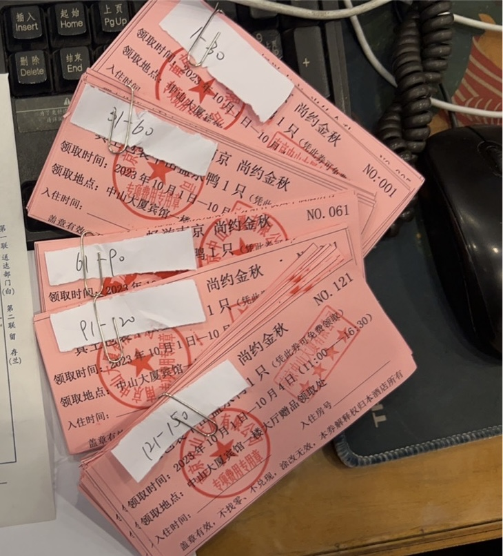 黃金周期間,房務部總臺班組聯(lián)合營銷部、餐飲部共同完成“暢游南京 尚約金秋”活動,共計送出酒店特色鹽水鴨210只。