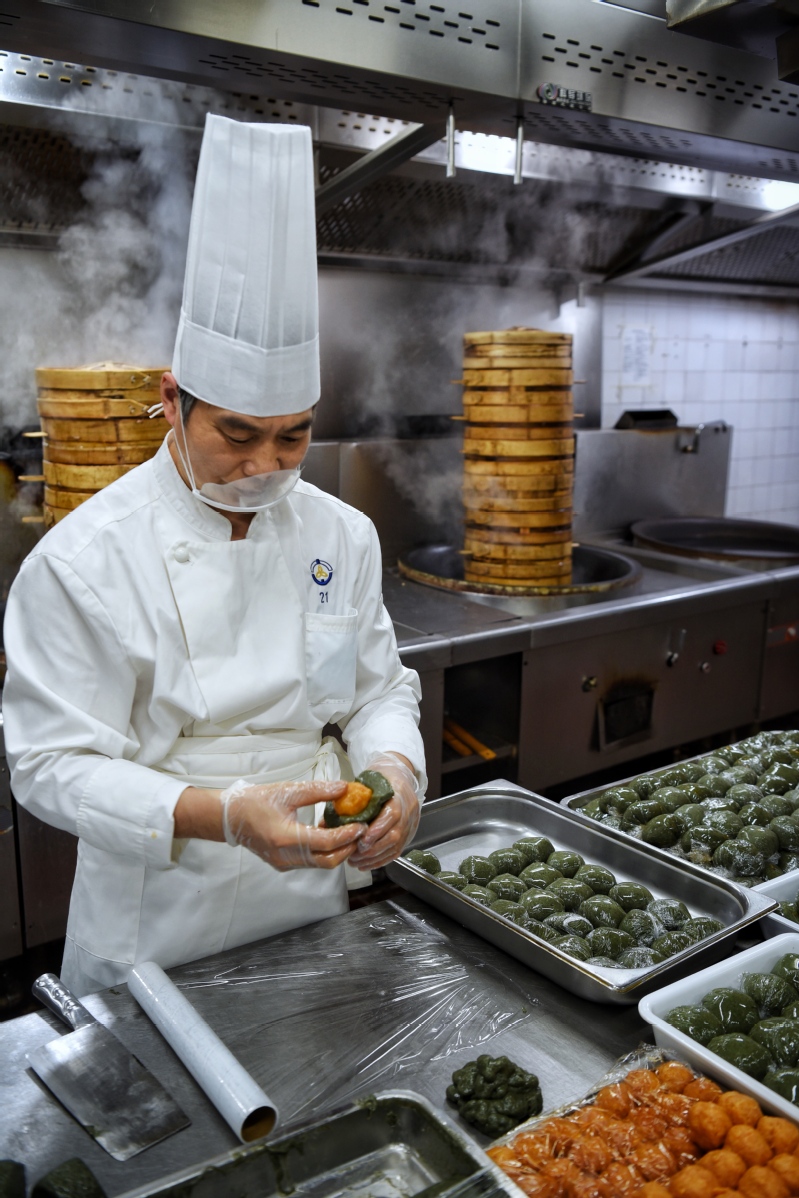 (李俊杰正在后廚為制作咸蛋黃肉松青團(tuán)嚴(yán)控餡料品質(zhì))