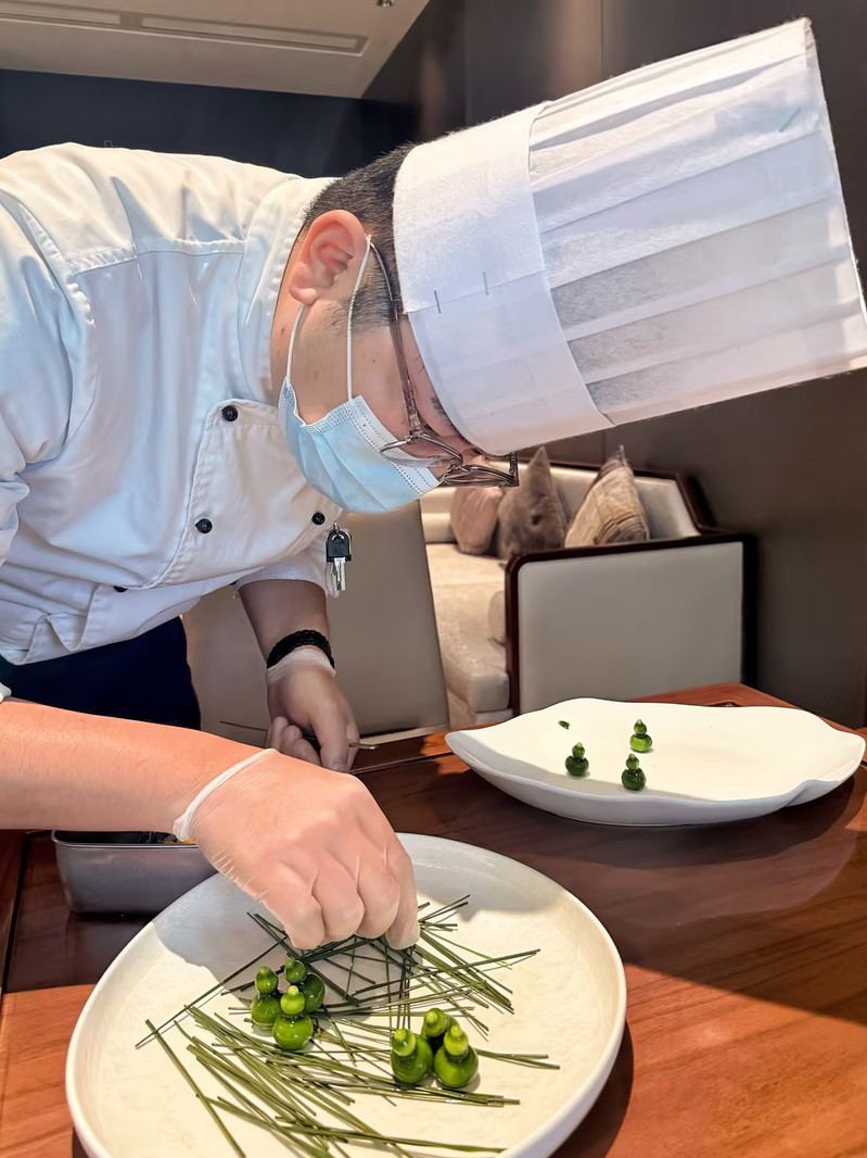 (時裕正在制作春季時令菜肴“翡翠玉葫冰豆爽”)